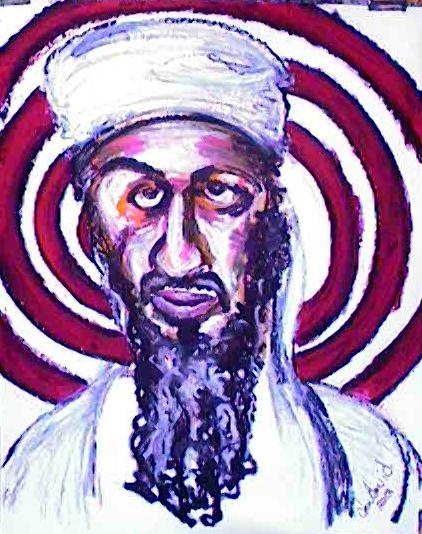 The 911 Tradgedy This work on paper was executed at The Palapas Art Gardens in Palm Springs, California immediately following the tragic 911 event. This was my way of purging my fears and frustrations with this inexcusable crime. The dartboard was "slashed" at my public easel several days after completion. I had this piece framed with slash marks and displayed the enormous portrait at The Desert Post Weekly for the next nine months. I was amazed at the power of healing through the mere eyes of the viewer however I am convinced the "slasher" thought my intention was to sensationalize Bin Laden and not to condemn him. The original work of art was confiscated by management until it debuted at The Faces In America Show in Cathedral City, California. DISCLAIMER: This is when the US public actually beleived that planes hit the Twin Towers and Bldg.7 as well as the tiny hole in the Pentagon! |